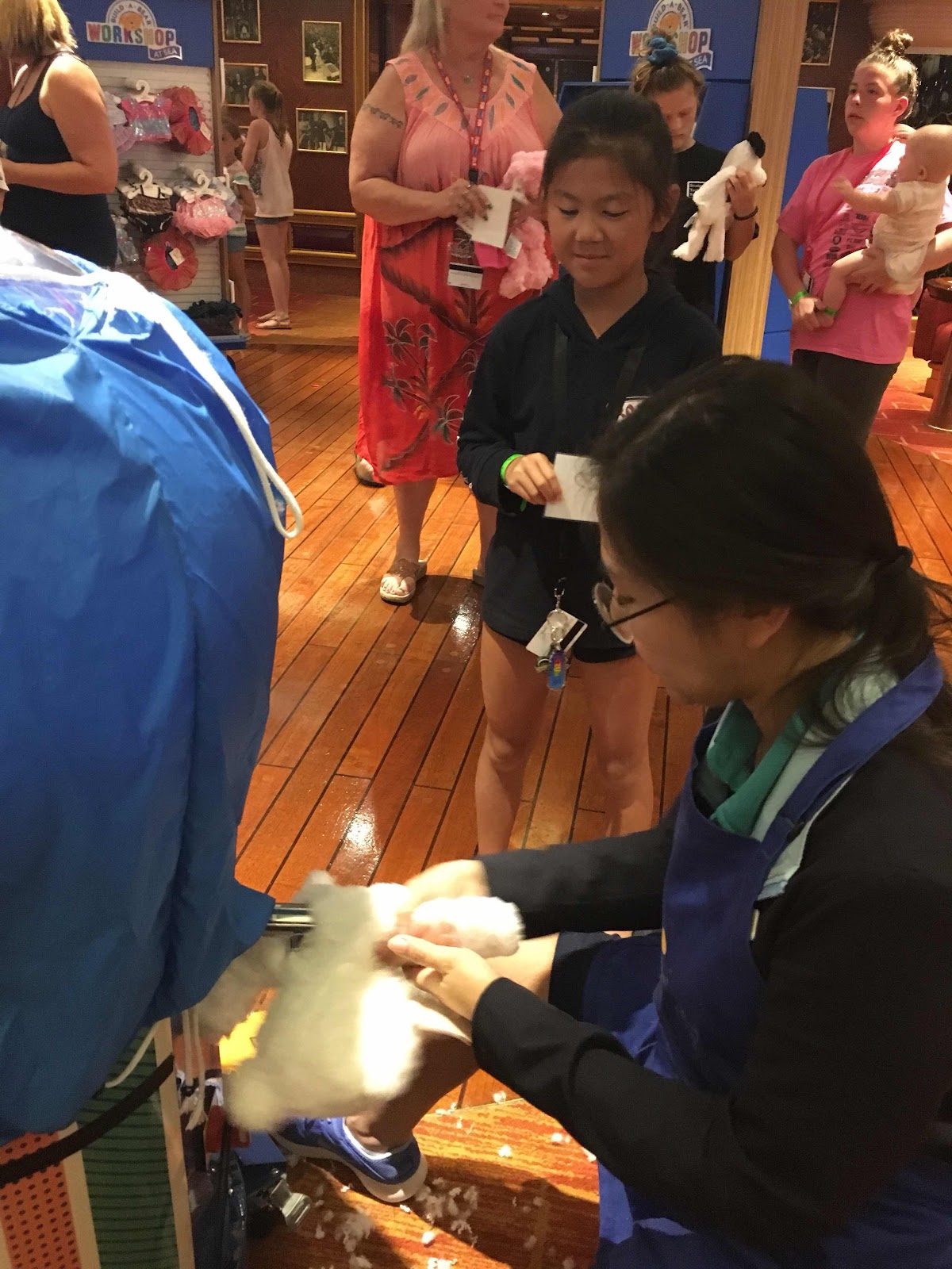 Bug has been waiting all week to spend her money in a Build a Bear. Today was her big day! She opted for a Carnival themed bear and named her Valorie (after our ship). So cute! Oh and don't you just love our door decorations?! We were the llama room and the teens were the donut room.