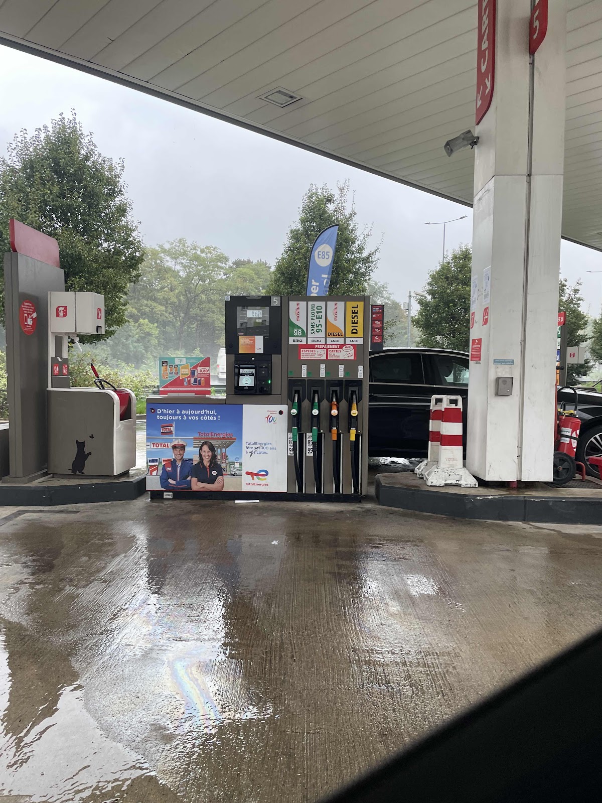 We stopped by gas station on way to airport. Stuck in lots of traffic so guess taking longer than he thought haha. We did see little gas pumps just randomly by theirselves in middle of streets in Paris. Lots of places to charge cars in middle of road inside Paris. This was the first real gas station we’ve seen.
